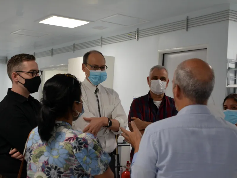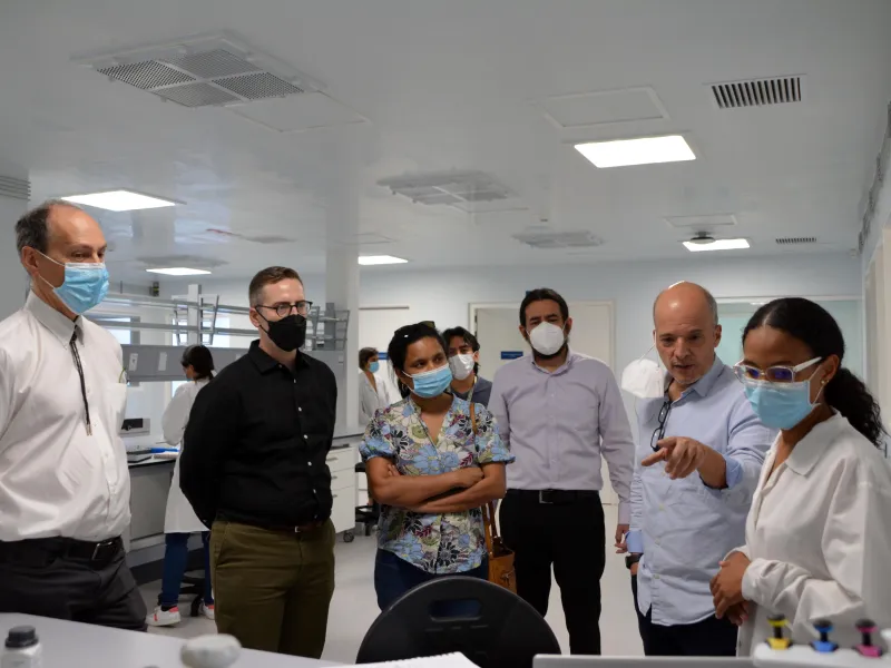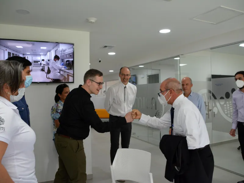 Durante el recorrido, los visitantes, acompañados por el padre Luis Felipe Gómez Restrepo S.J, rector de la Javeriana de Cali, el doctor Andrés Jaramillo Botero, Director Científico de iÓMICAS y miembros del equipo científico del instituto, como también del Centro Internacional de Agricultura Tropical – CIAT (aliados en el ecosistema científico nacional ÓMICAS y parte del secretariado de la PTFI, con el American Heart Association), lograron apreciar los avances locales en materia de estrategias, métodos y productos, basados en la caracterización de organismos vivos en los diferentes niveles de la jerarquía ómica para dilucidar los mecanismos fundamentales que regulan su nutrición y salud.